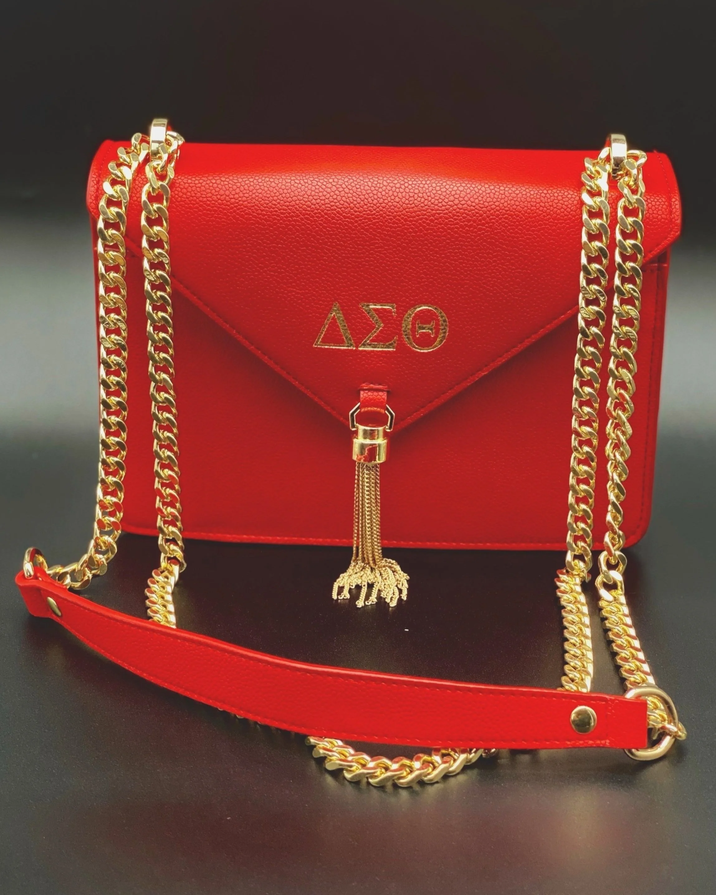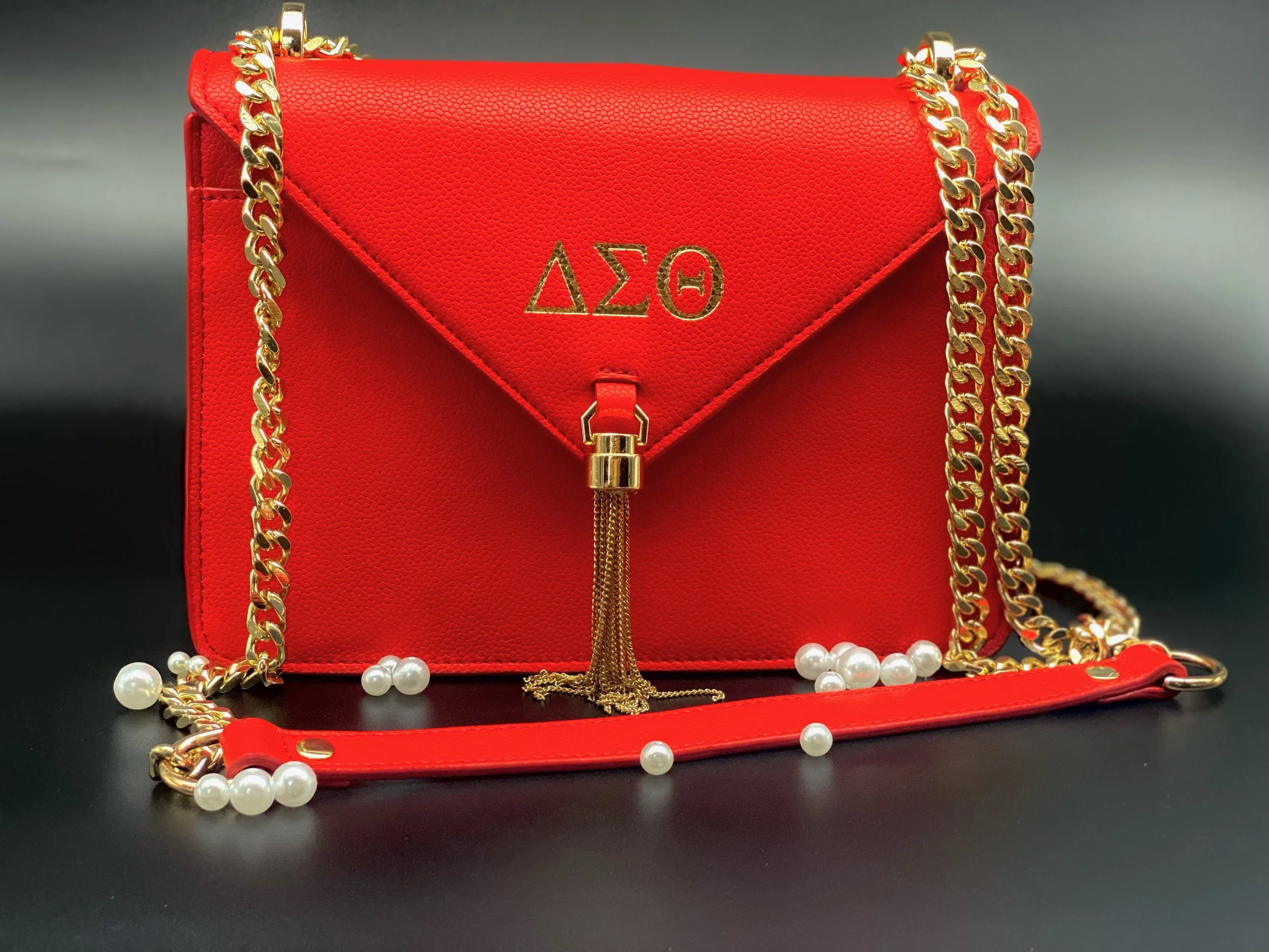 Vogue is a chic and versatile handbag with a stylish convertible chain handle that can be worn cross-body or hung elegantly from the shoulder. Vogue is crafted from genuine leather and accented with a magnetic tasseled front closure.